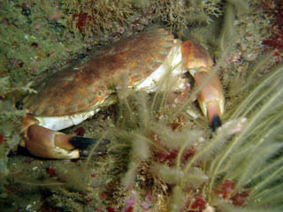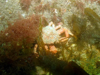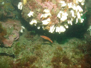 As above. Nice reef system with gullies and huge blocks of stone. In one place it was like a wall dive. All surfaces covered in aneonomes, dead mans fingers and urchins. After exploring the reef we went out a bit and picked up some current. Nice drift along a sandy bottom with the occasional rocky area which was full of life. Plenty of cuckoo wrasse and ballen wrasse as well as velvet swim crabs.