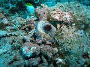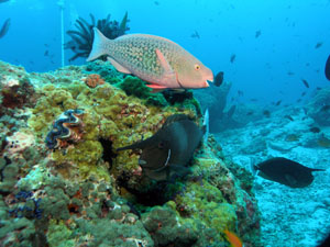 The coral here is very poor as it's such a popular site being one of the best manta cleaning stations around. As well as the mantas we saw 2 turtles, a large octopus out in the open and lots of big parrotfish and groupers. The current was fairly strong and was difficult to stay still to watch the mantas on the cleaning station.