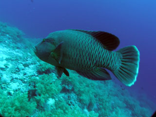 I was at the back of the group on the swim back to the boat and half way back there was a lot of gesturing. I turned around and the big old Napoleon Wrasse had followed us. I stopped and hovered as it swam around me at about 2m distance twice keeping an eye on me all the time, then returned back to the reef.